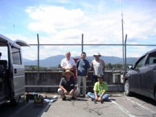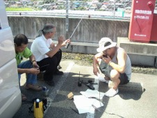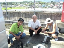 いなべ市内ではジャスコ大安店屋上の無線中継局を開設して通信訓練に協力無線局開設準備中の「いなべ非常通信ボランティア」のメンバー |