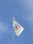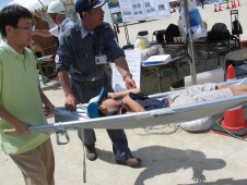 12時ごろ、日赤テント通信所の手前で少年が熱中症で倒れた救護ボランティアとして、この様な事態を想定してタンカを準備していた |