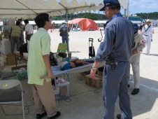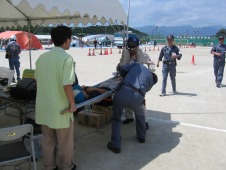 収容作業中の救護ボランティア訓練中とはいえ最短時間で救急車に収容、図らずも平素の訓練の成果を発揮した |